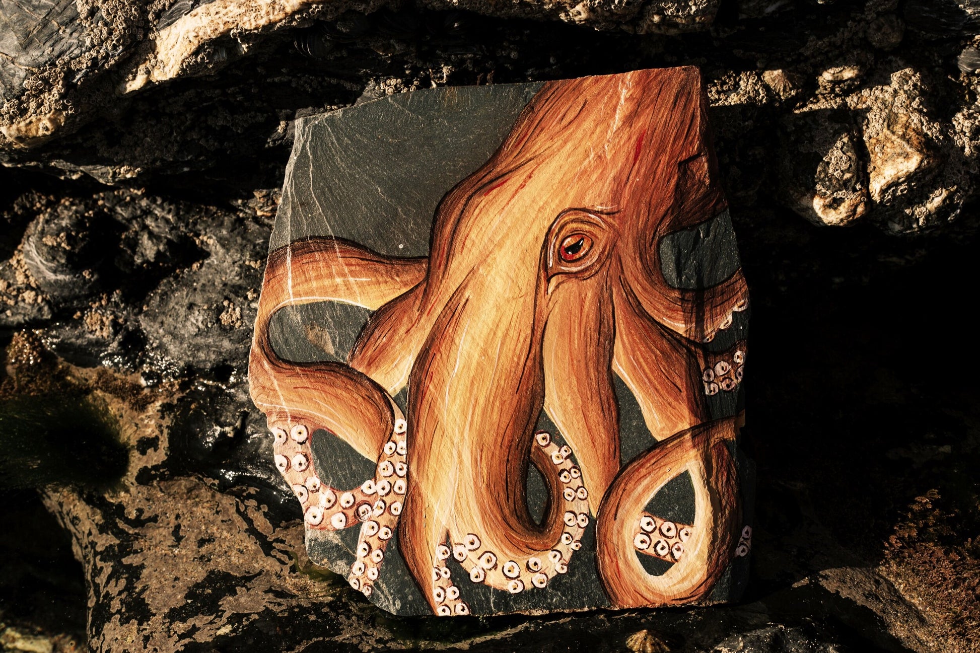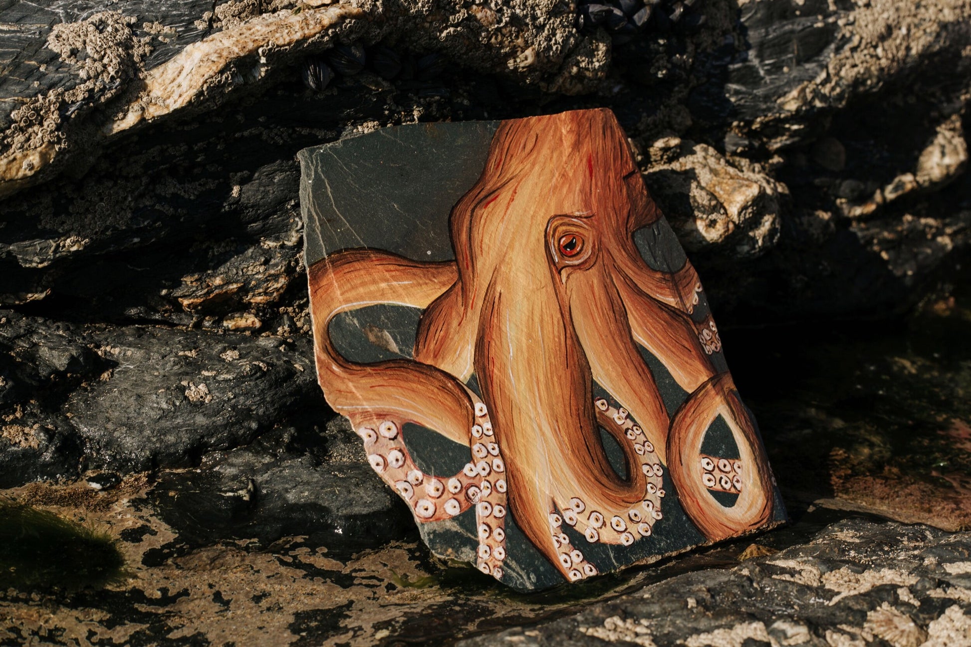 An original watercolour painting, featuring a common octopus on a found piece of found slate.