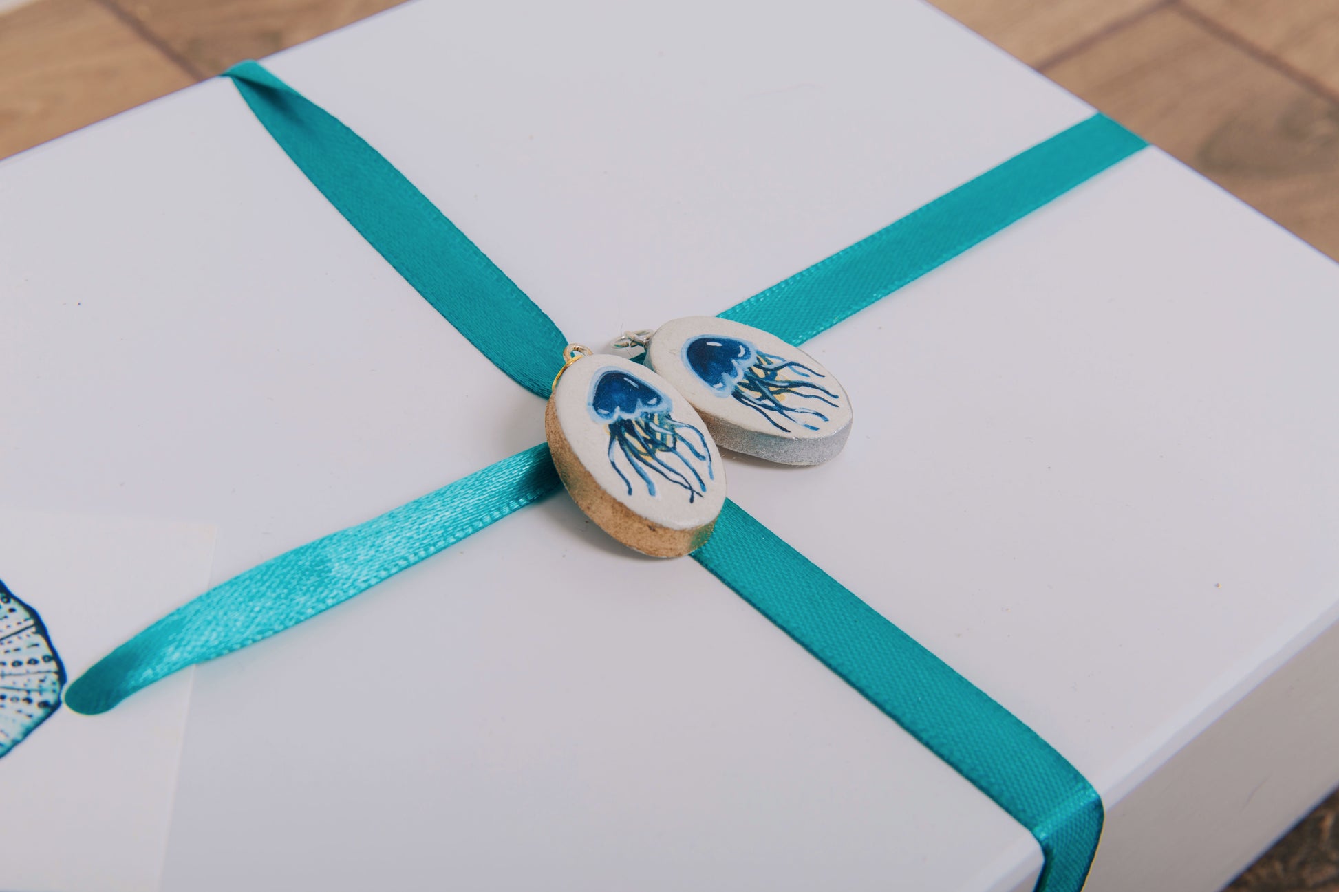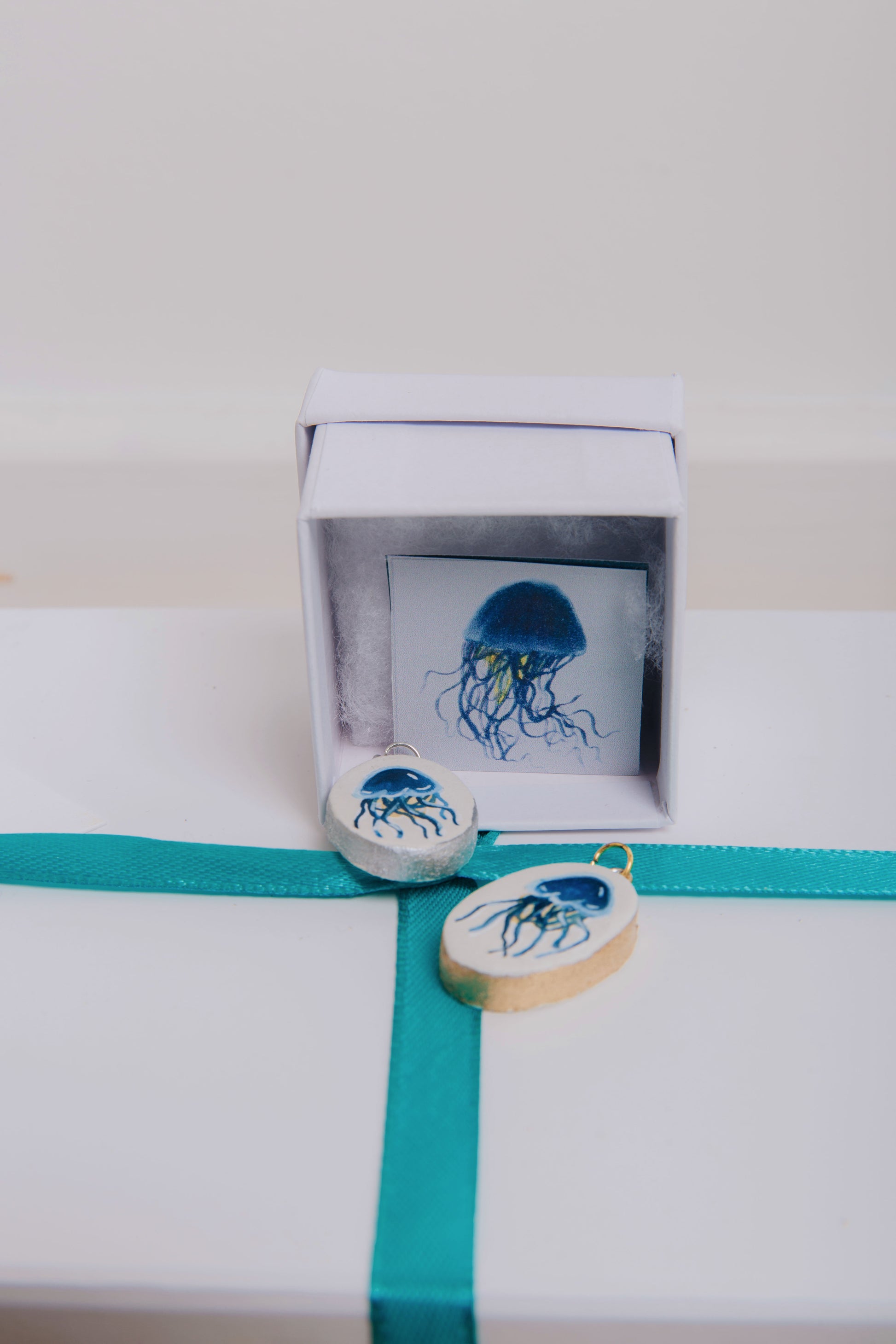A hand painted clay pendant featuring a Blue Jellyfish. Each pendant is 30mm in size. Each pendant is a mini wearable piece of art, featuring a mini watercolour original.