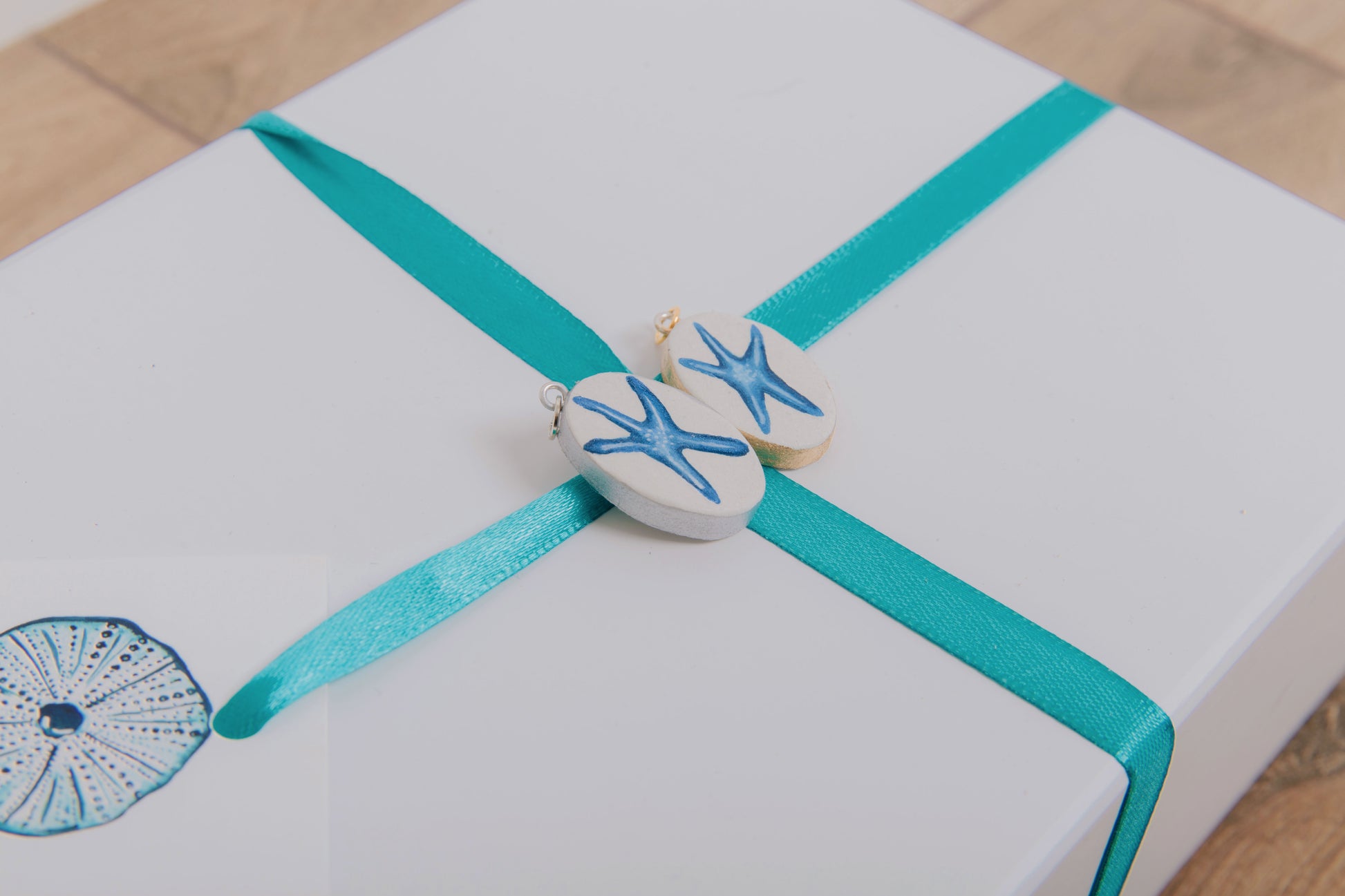 A hand painted clay pendant featuring a Blue Starfish. Each pendant is 30mm in size. Each pendant is a mini wearable piece of art, featuring a mini watercolour original.