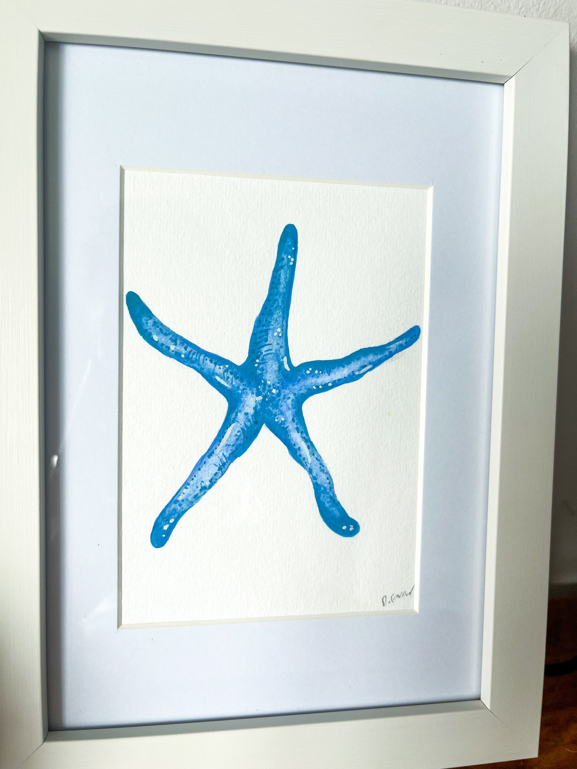 Watercolours on medium grain 300gsm watercolour paper. A6 in size. Framed in a white wood effect frame.