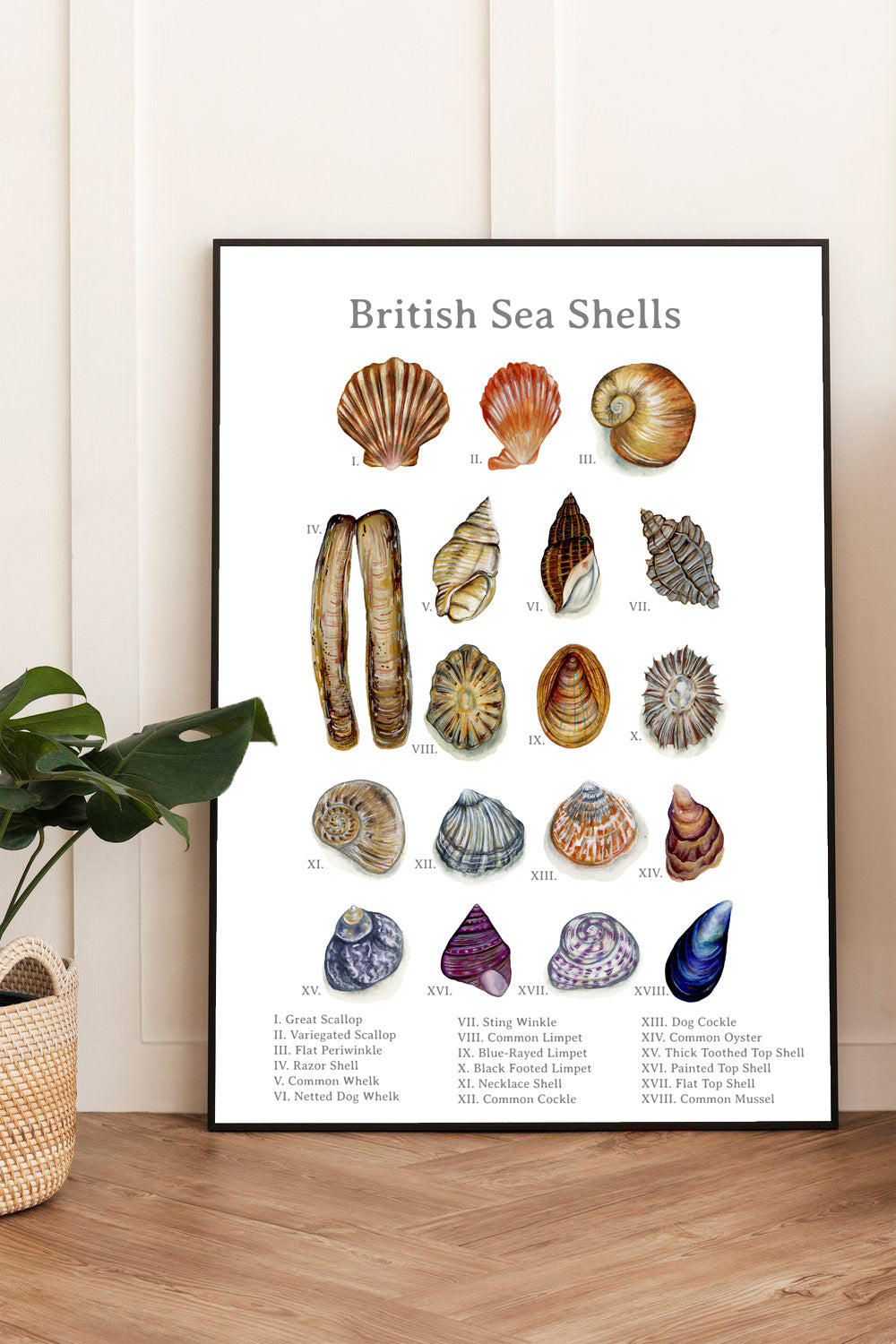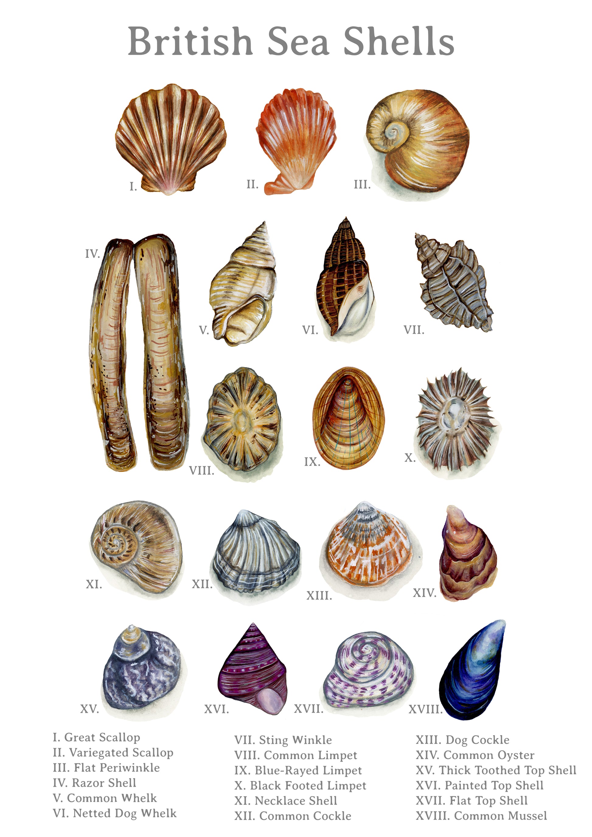 A fine art print featuring 18 sea shells found along the British coast. This print is inspired by vintage scientific pages found in nature guides, meaning this print features roman numbers and species names. The perfect print for any shell lover!