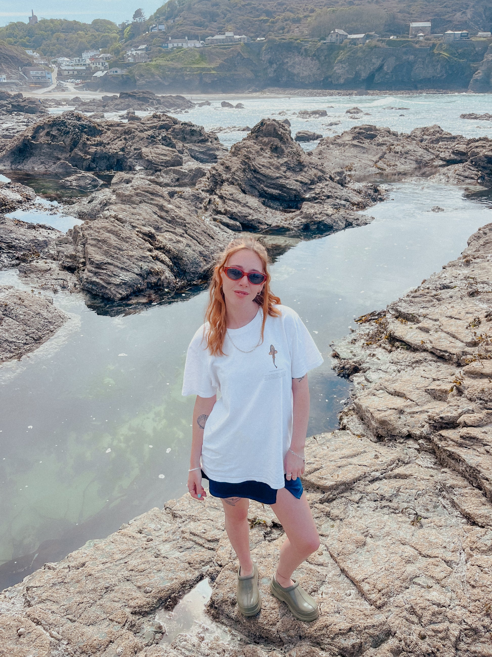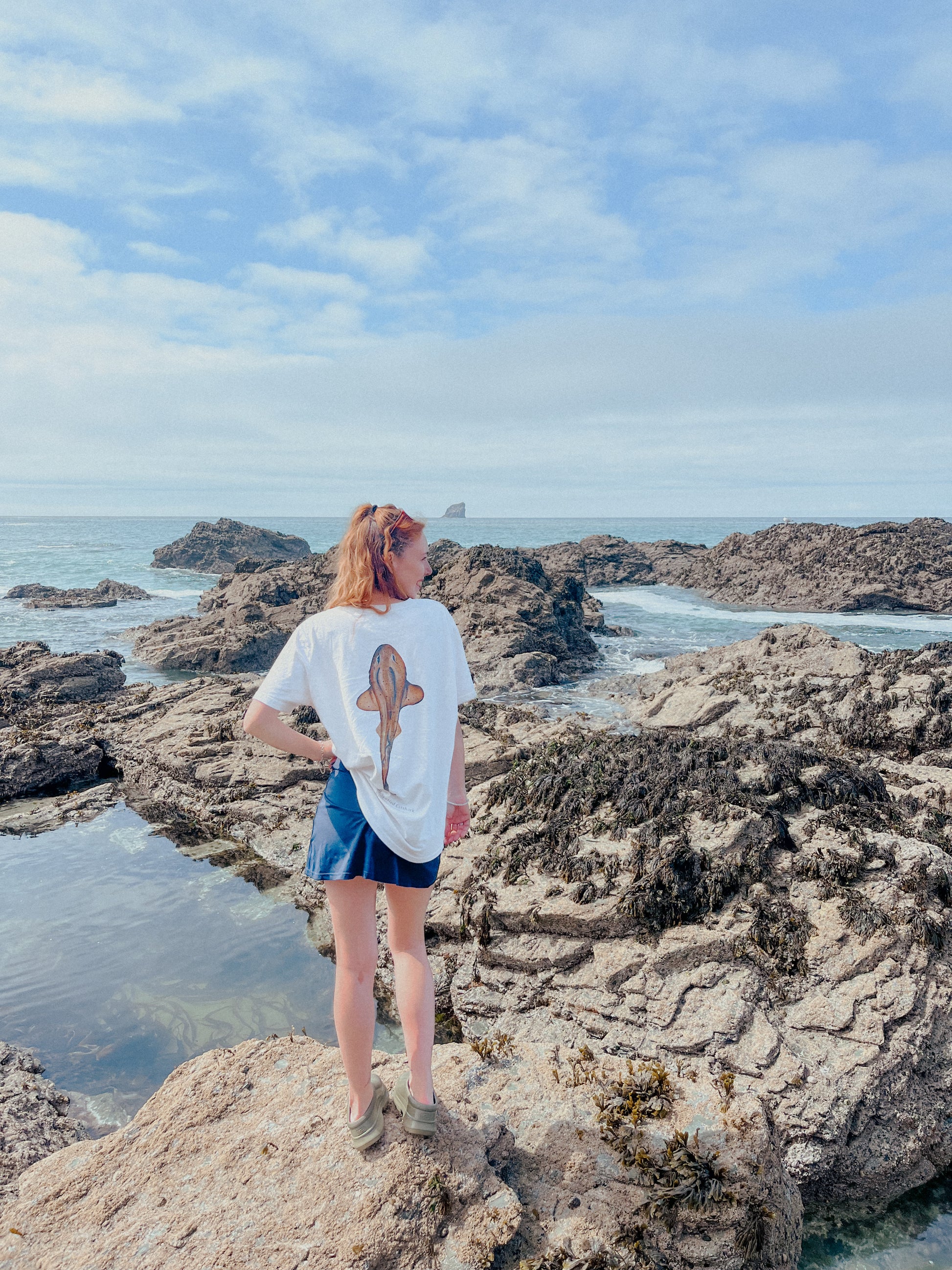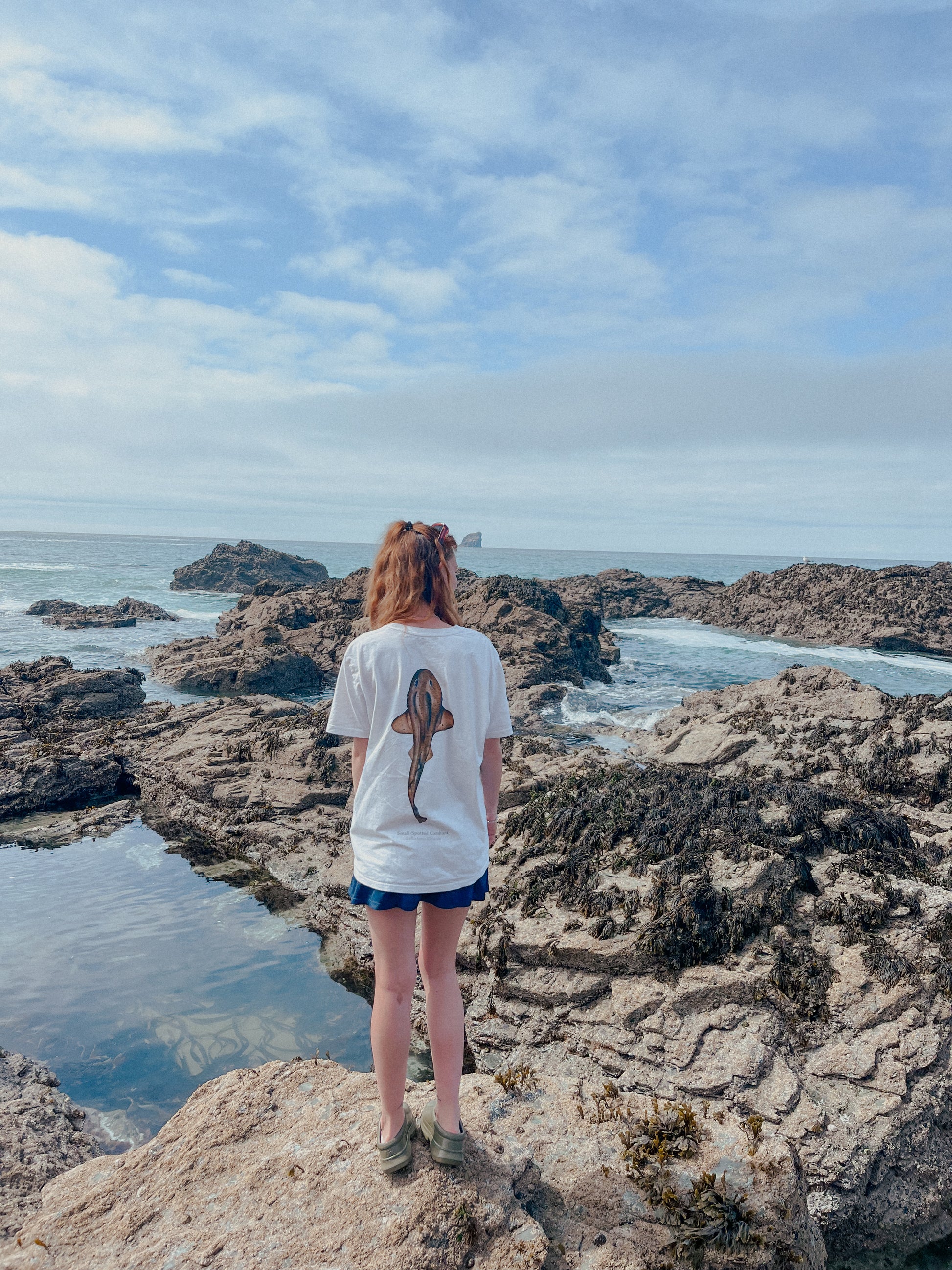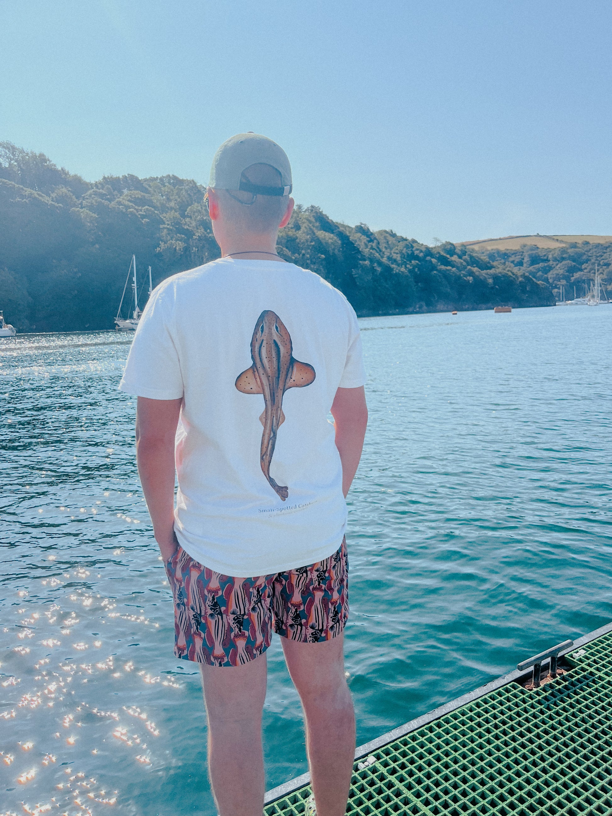 Shark lovers, this one is for you! It's the ultimate shark tee, featuring the UK's cutest shark... the Small-Spotted Catshark. A bold back print featuring my watercolour illustration of this shark, paired with a subtle tiny shark on the front, alongside a shark fun fact from the Ocean Lover’s Guide. It’s the perfect merch to pair with your copy of the guide, or just to show how much of a shark lover you are!