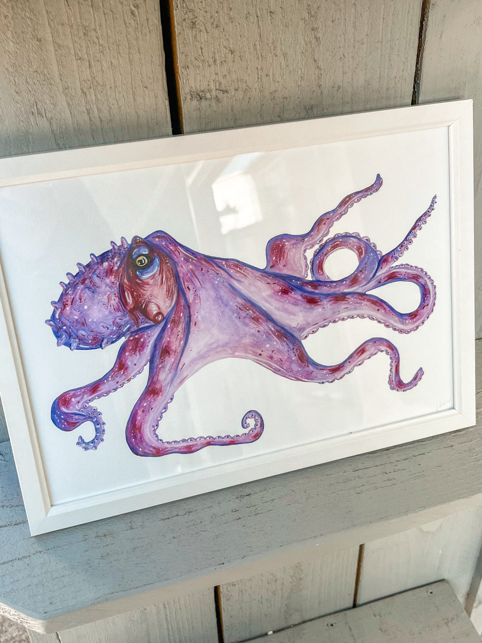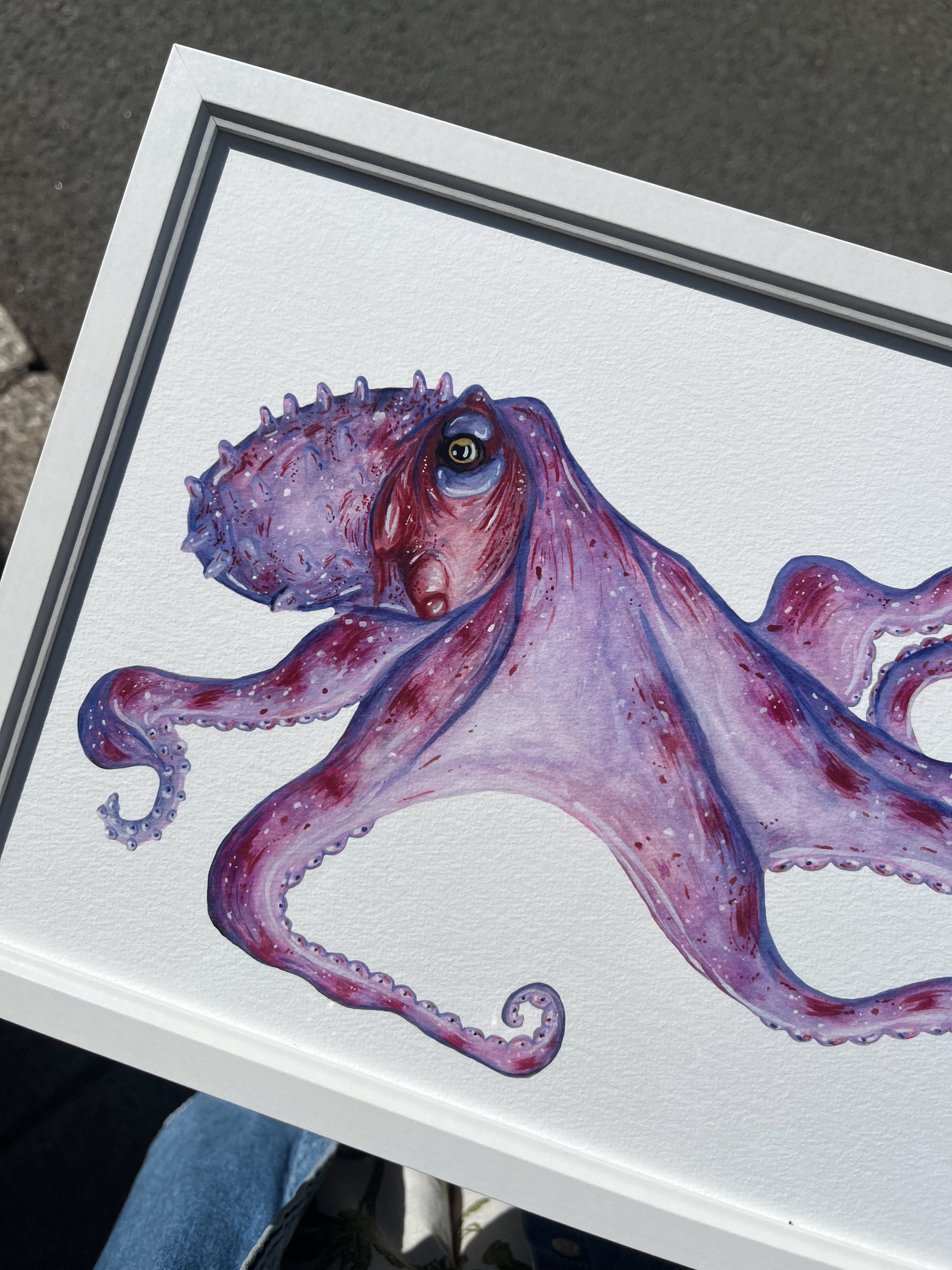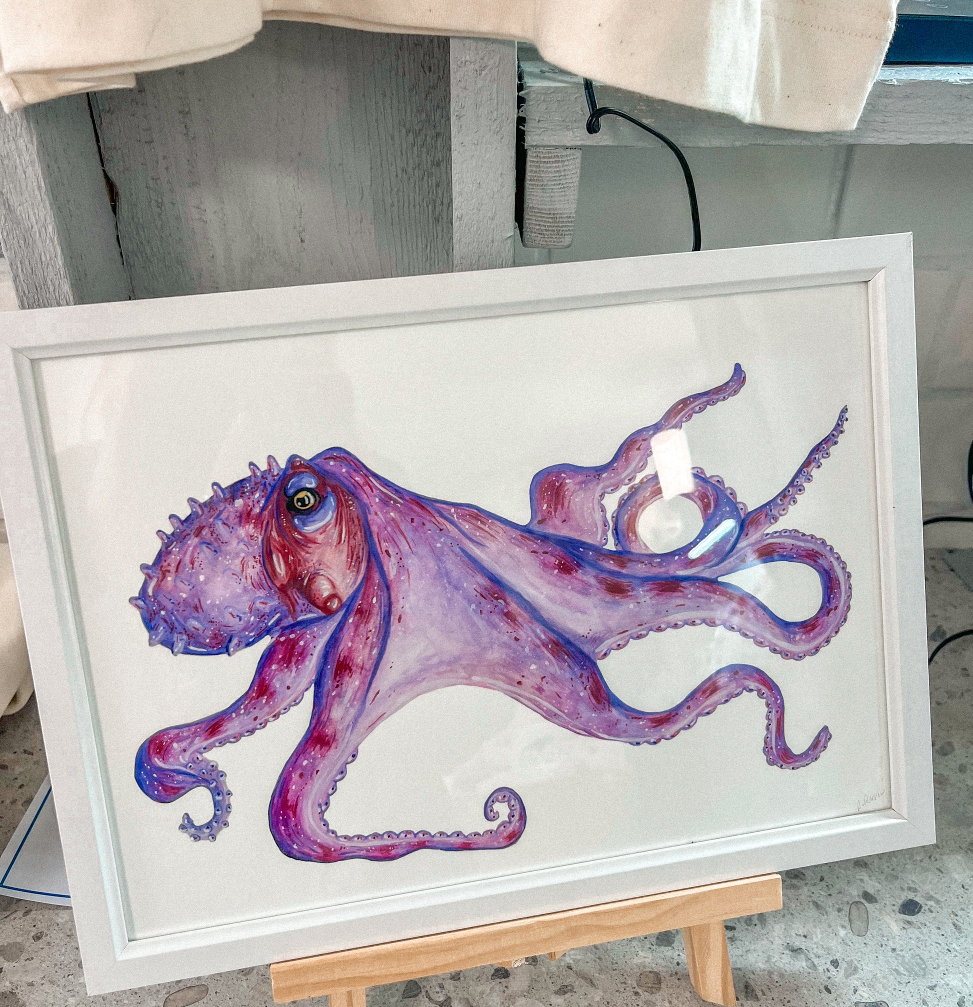 A framed A4 fine art print featuring my original Octopus. Painted on my week long pop up shop in Fowey, Cornwall! The perfect addition to any ocean lover's home.