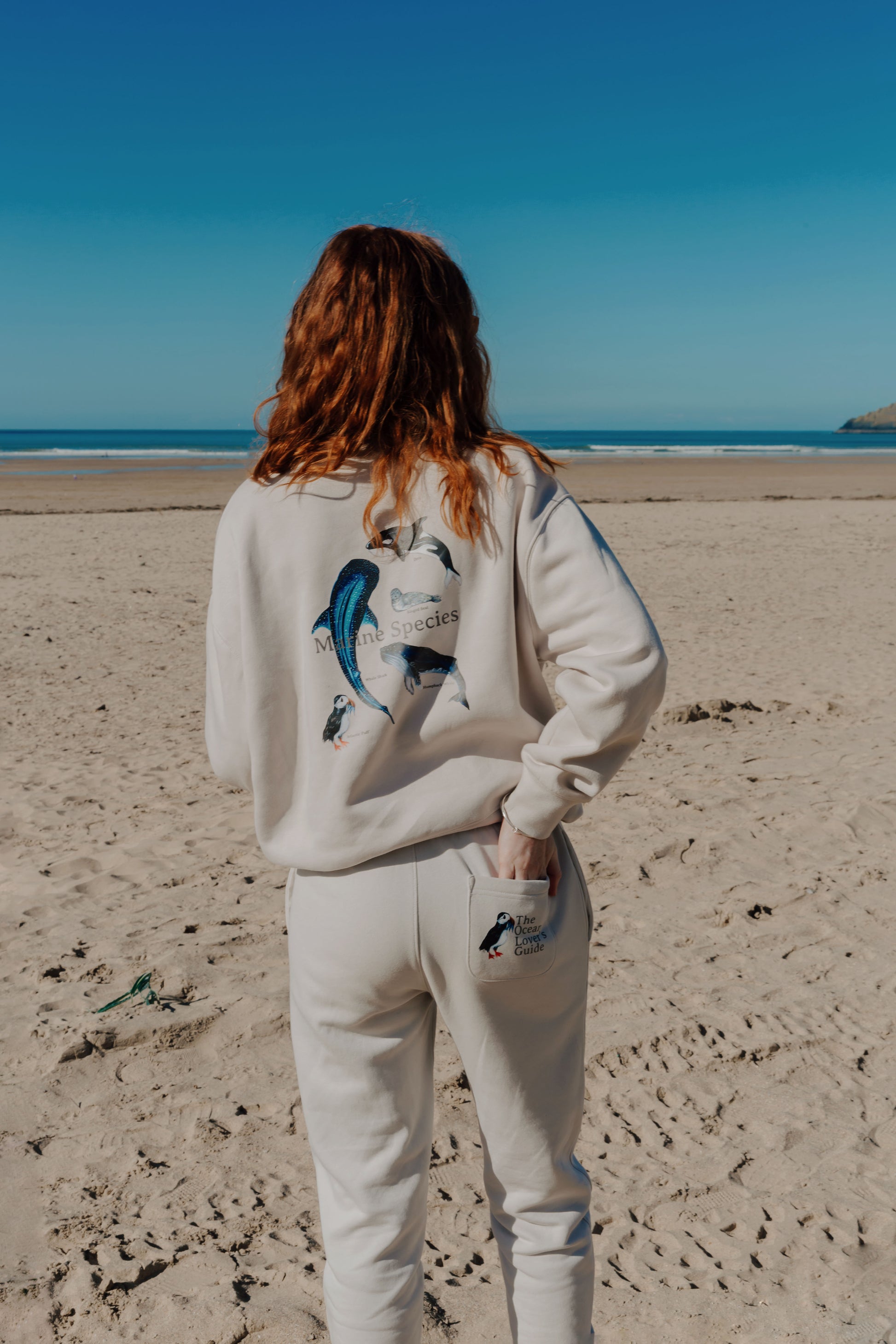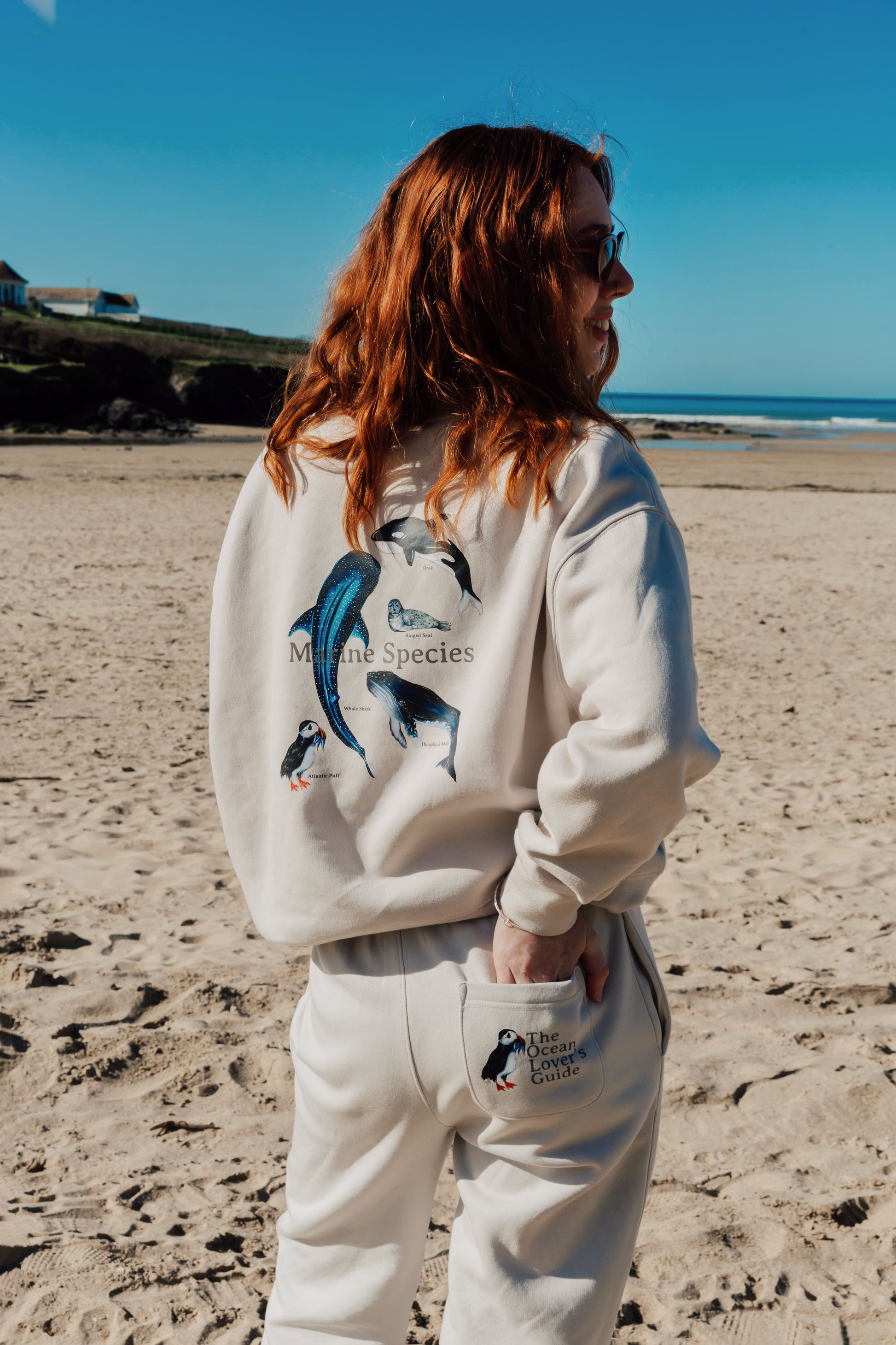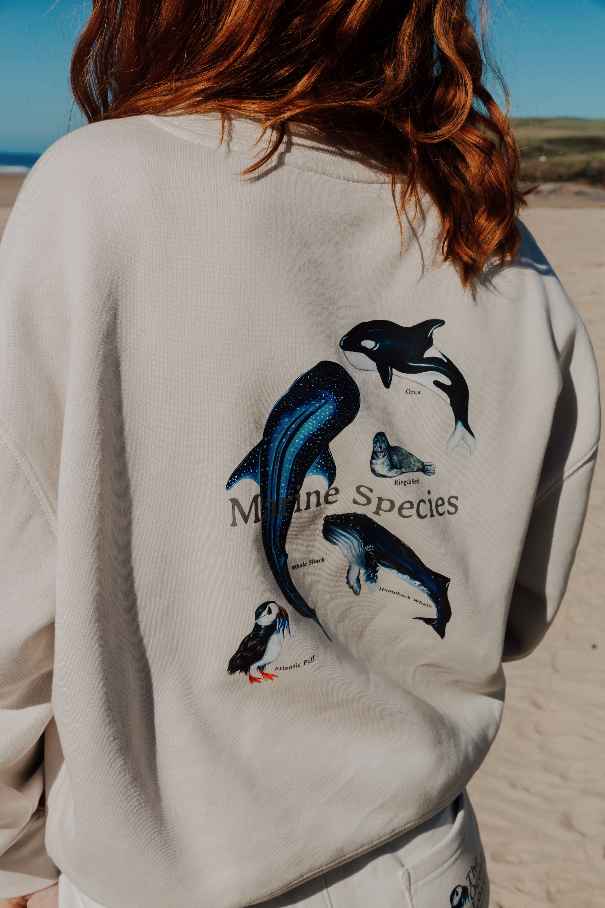 Ocean lover’s, your dream sweater is here! Inspired by our best selling Marine Species Tee… we introduce to you Marine Species 2.0. But this time on the cosiest sweater there is. Taking inspiration from vintage wildlife posters, to bring a modern wearable piece of art. With the small Whale Shark feature on the front, one of our best-selling designs! As well as the Puffin, Orca and more on the back!