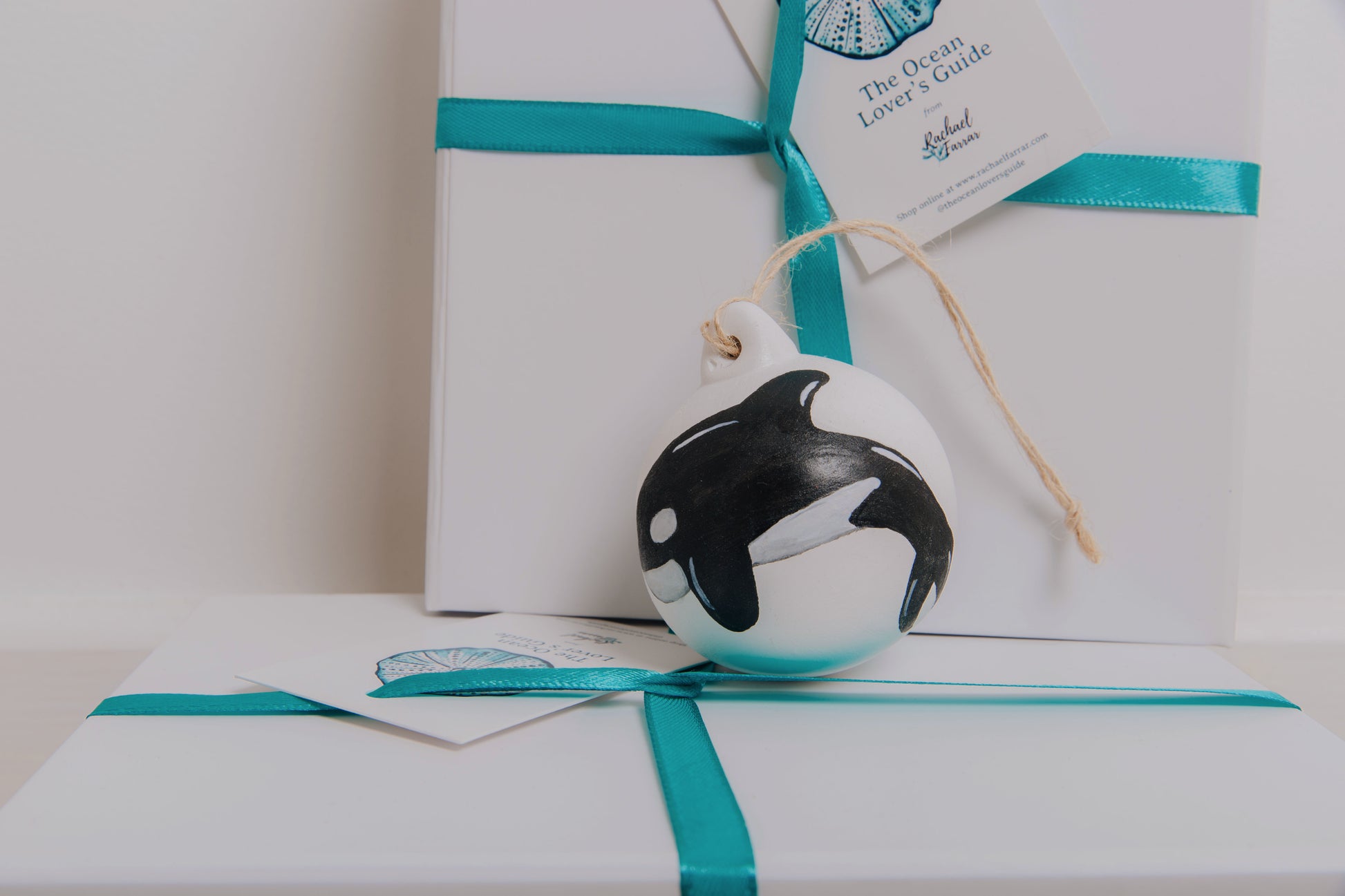 A hand painted porcelain bauble featuring an Orca. Each porcelain bauble is 6cm in diameter. The perfect addition to any ocean lovers Christmas tree or to keep up as a special ornament all year round! Each bauble will come on brown twine ready to hang straight on your tree.