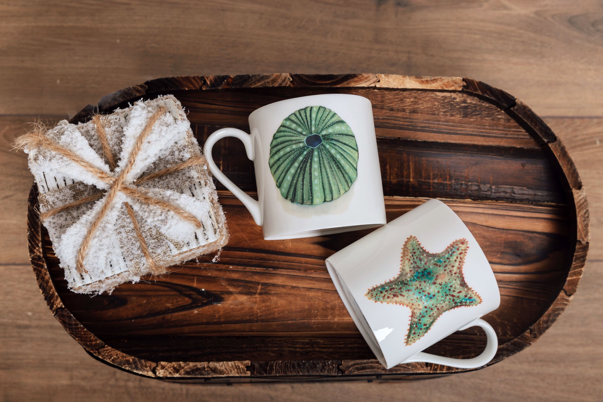 A fine bone china mug featuring my original sea urchin painting. Each mug is fired by hand here in the UK, and a great size for your favourite coffee or tea!