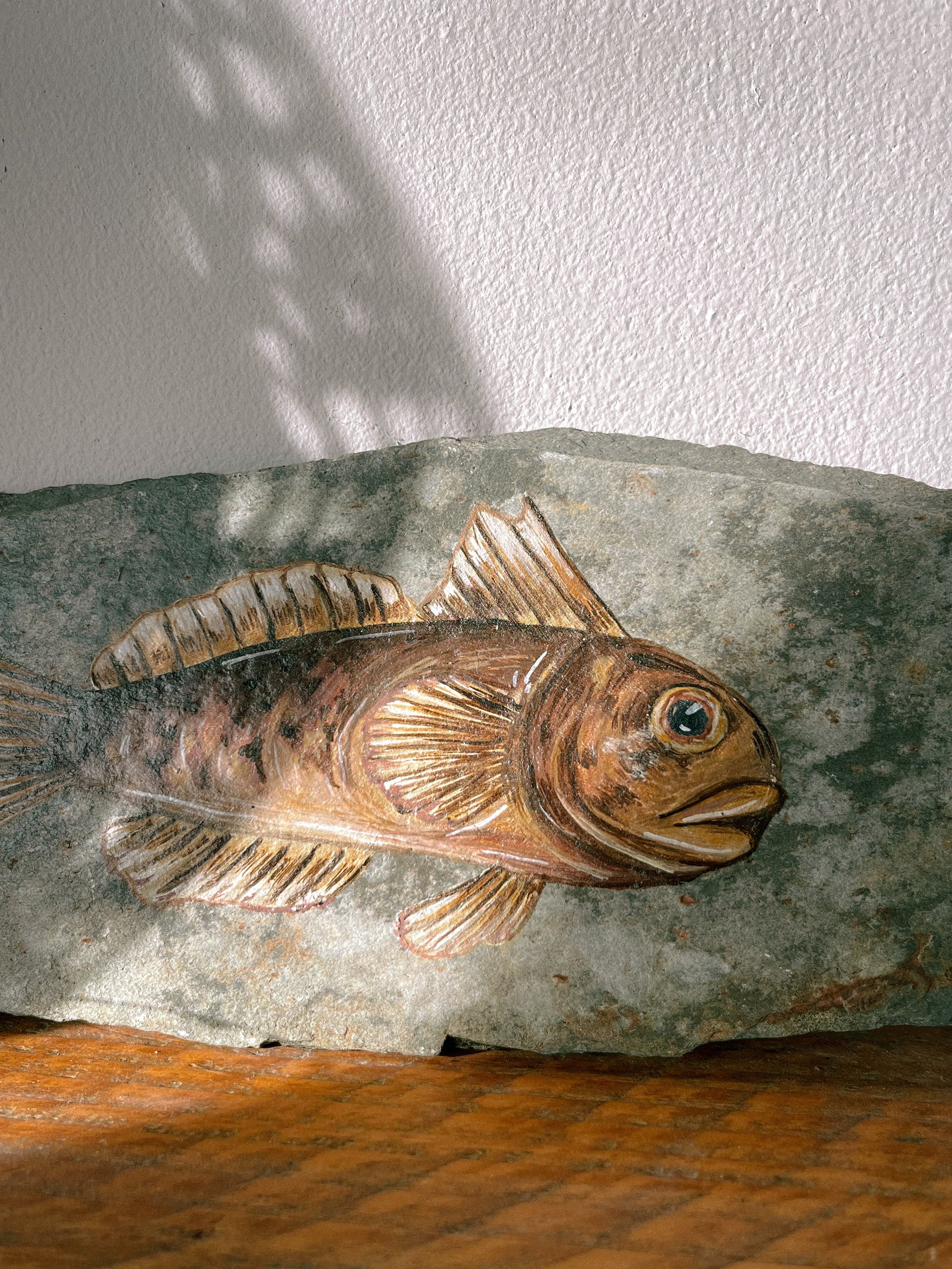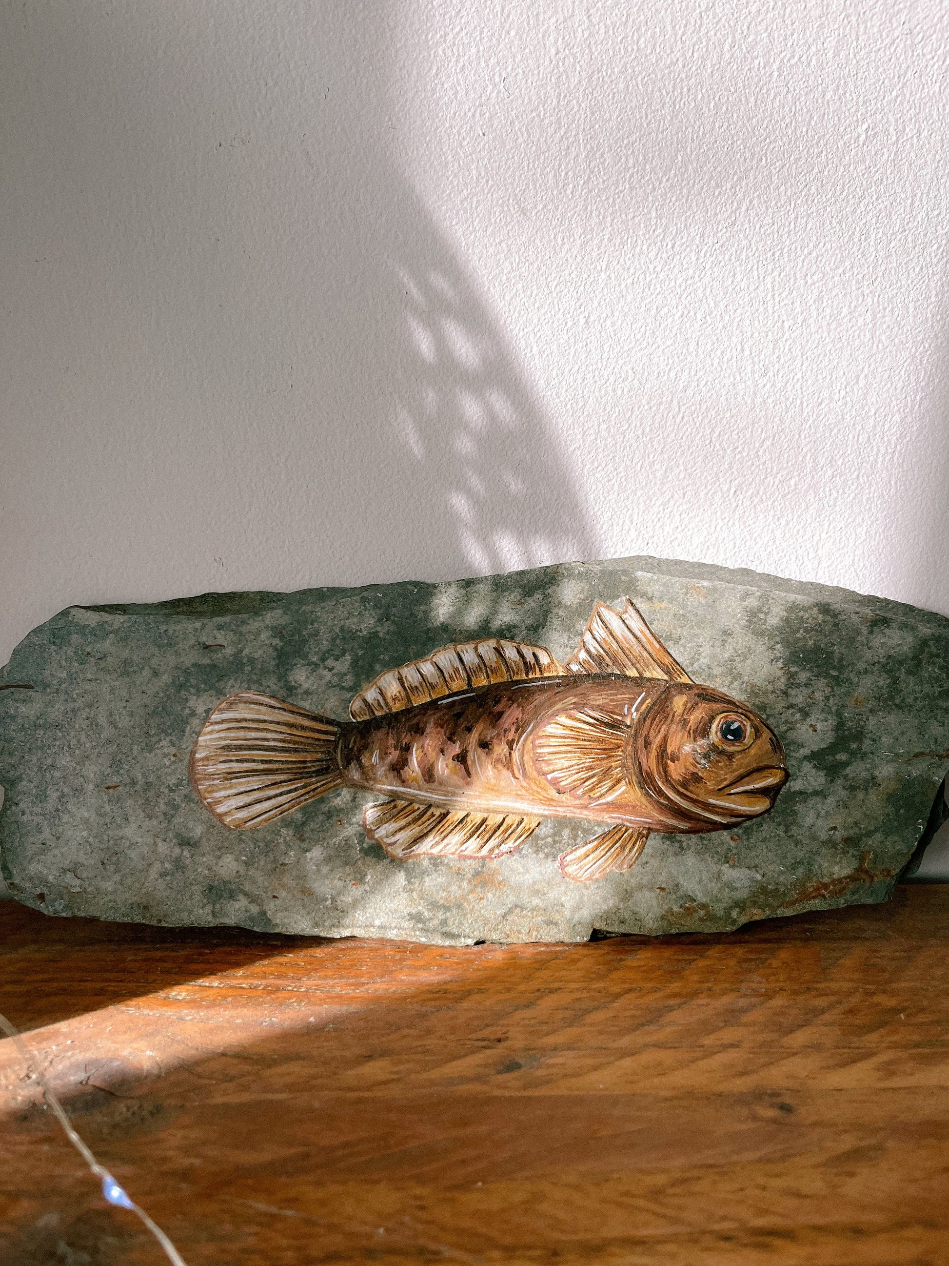 An original watercolour painting, featuring a rock goby on a found piece of found slate.