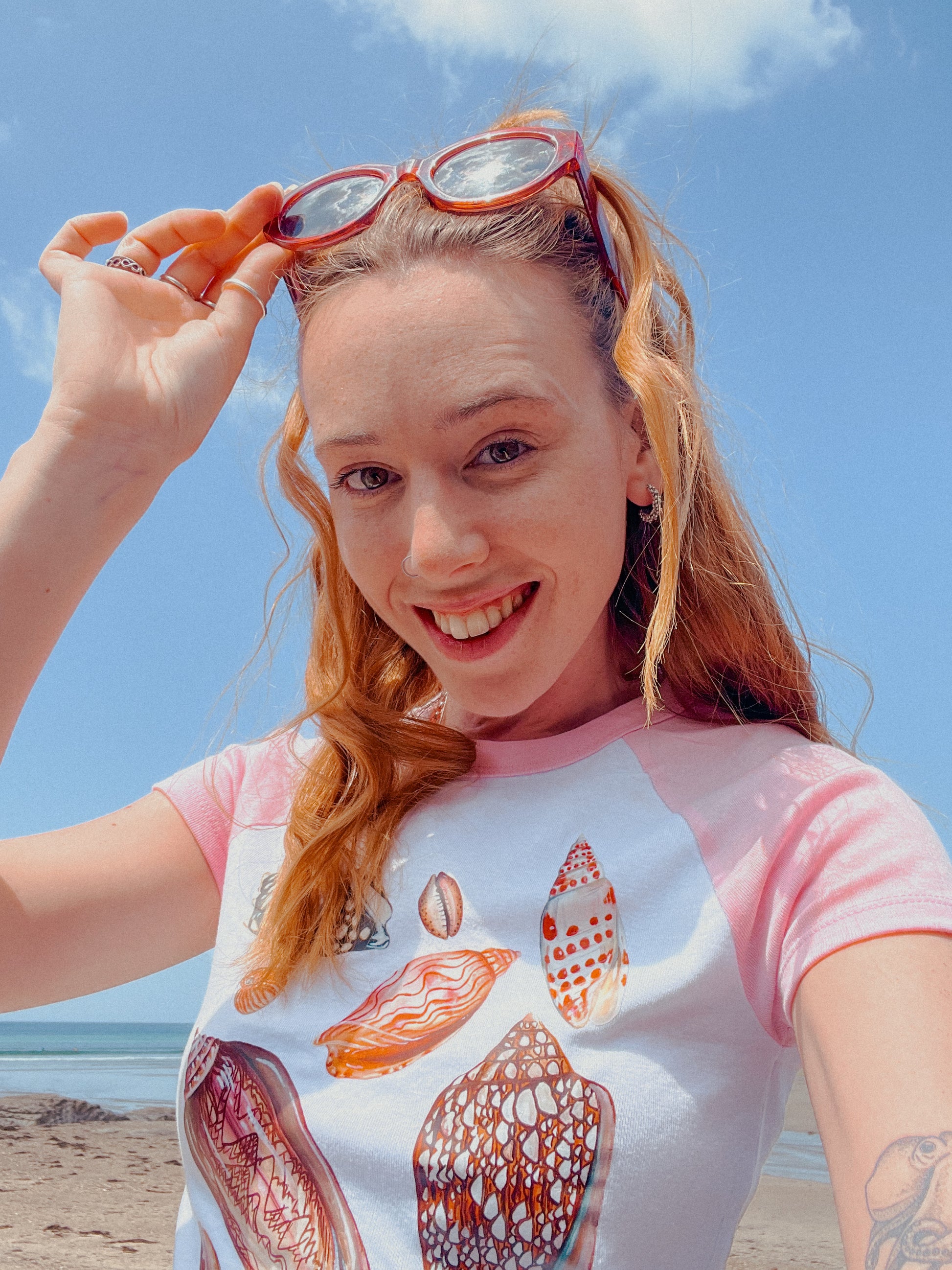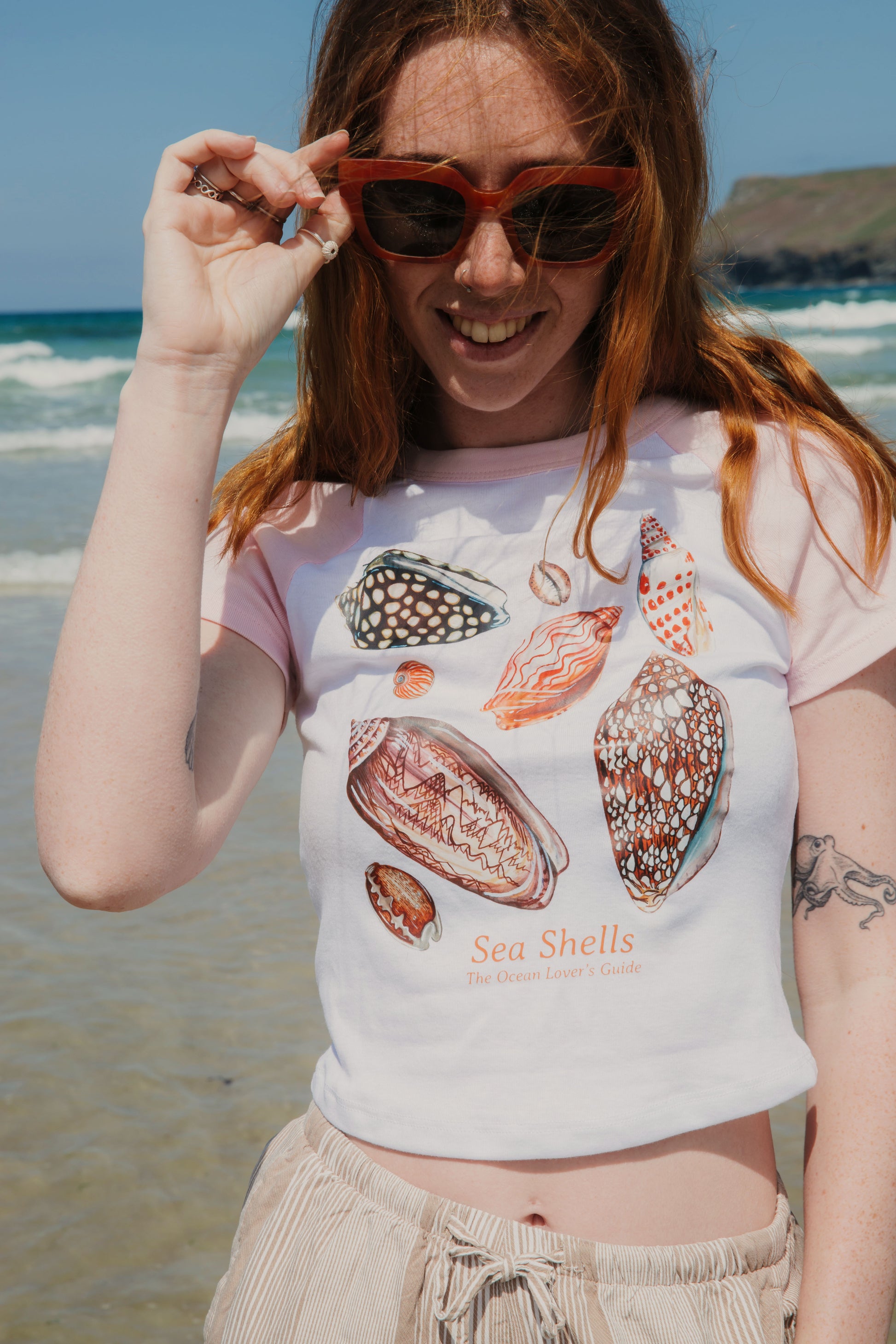A shell-lover’s summer essential. This baby tee is inspired by shoreline finds and the beauty of collecting small treasures. Featuring detailed hand-drawn shells, it’s soft, slightly cropped, and perfect for pairing with your favourite denim shorts or linen trousers this summer. Complete with baby pink raglan sleeves, that compliment the shells perfectly.