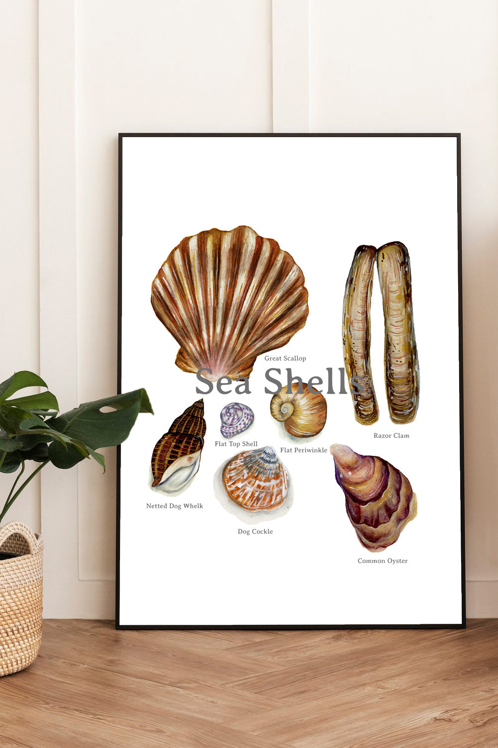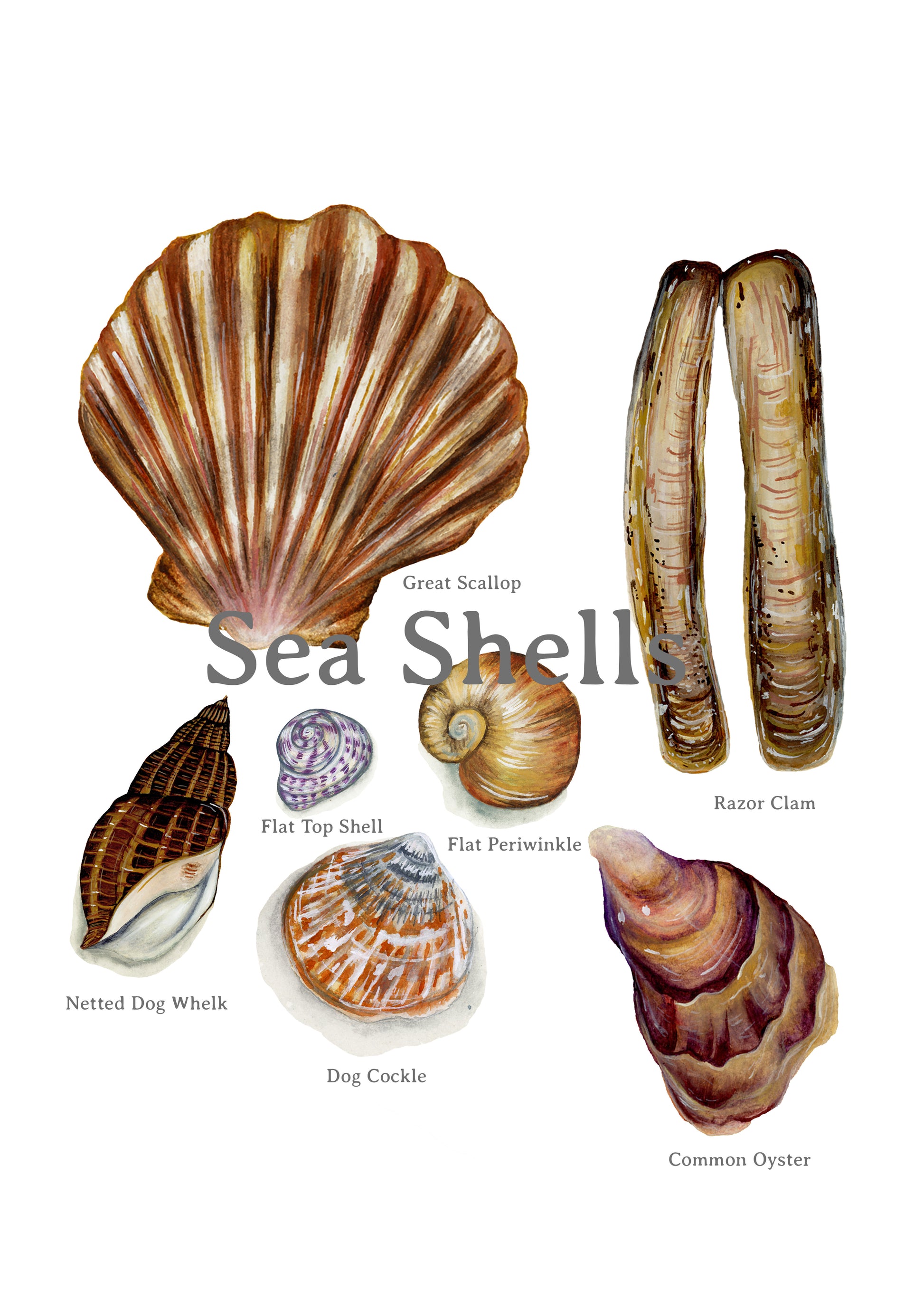 A fine art print featuring a range of my original sea shell paintings. For every shell lover, this features some of your favourite pieces found along the shoreline. You’ll love matching up your beach combing finds to this poster! Printed on 320gsm Hahnemulhe paper.