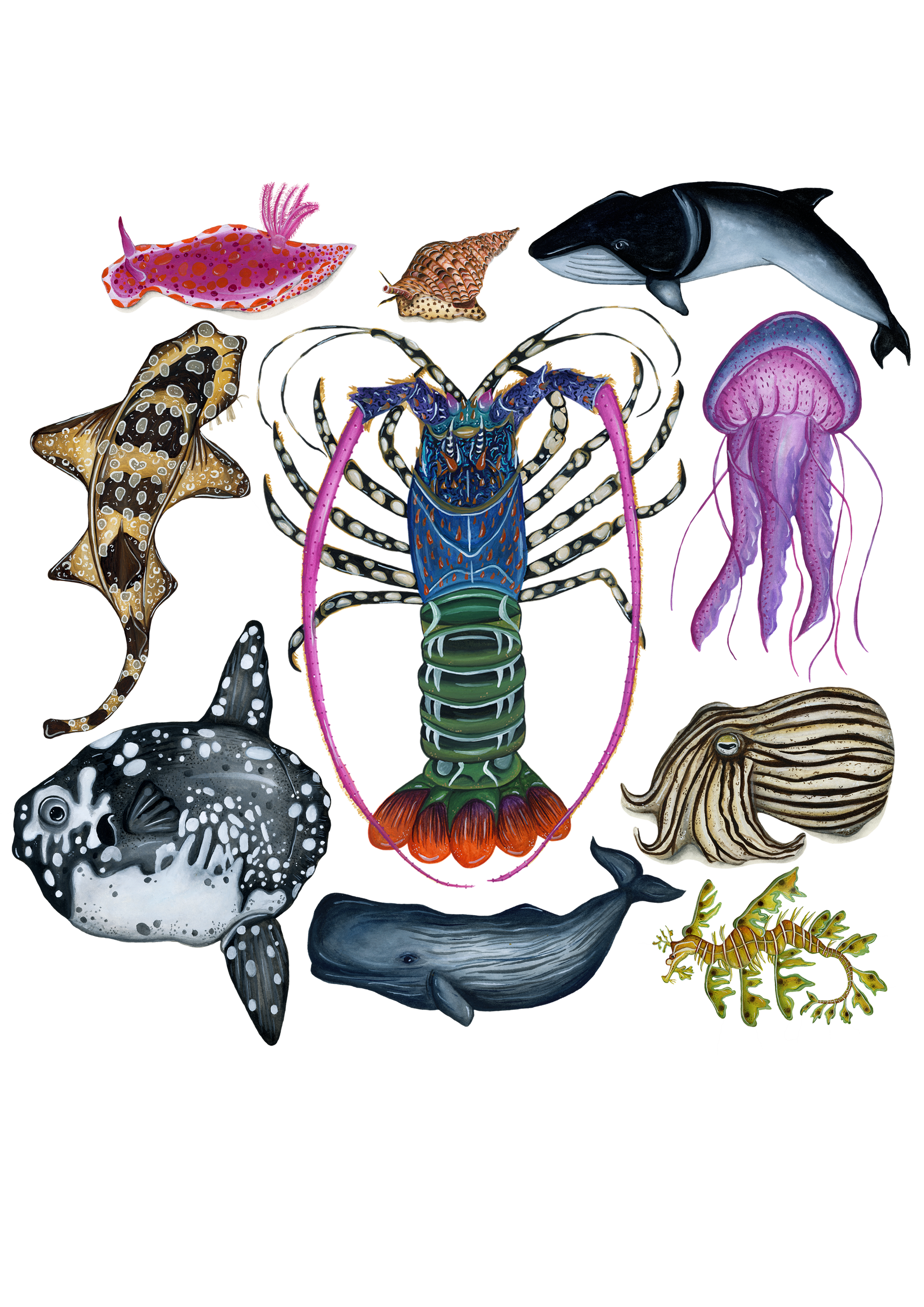 This print features a selection of my newest paintings, including the vibrant and beautiful Ornate Rock Lobster, the weird and wonderful Mola Mola and the beautiful Leafy Seadragon.