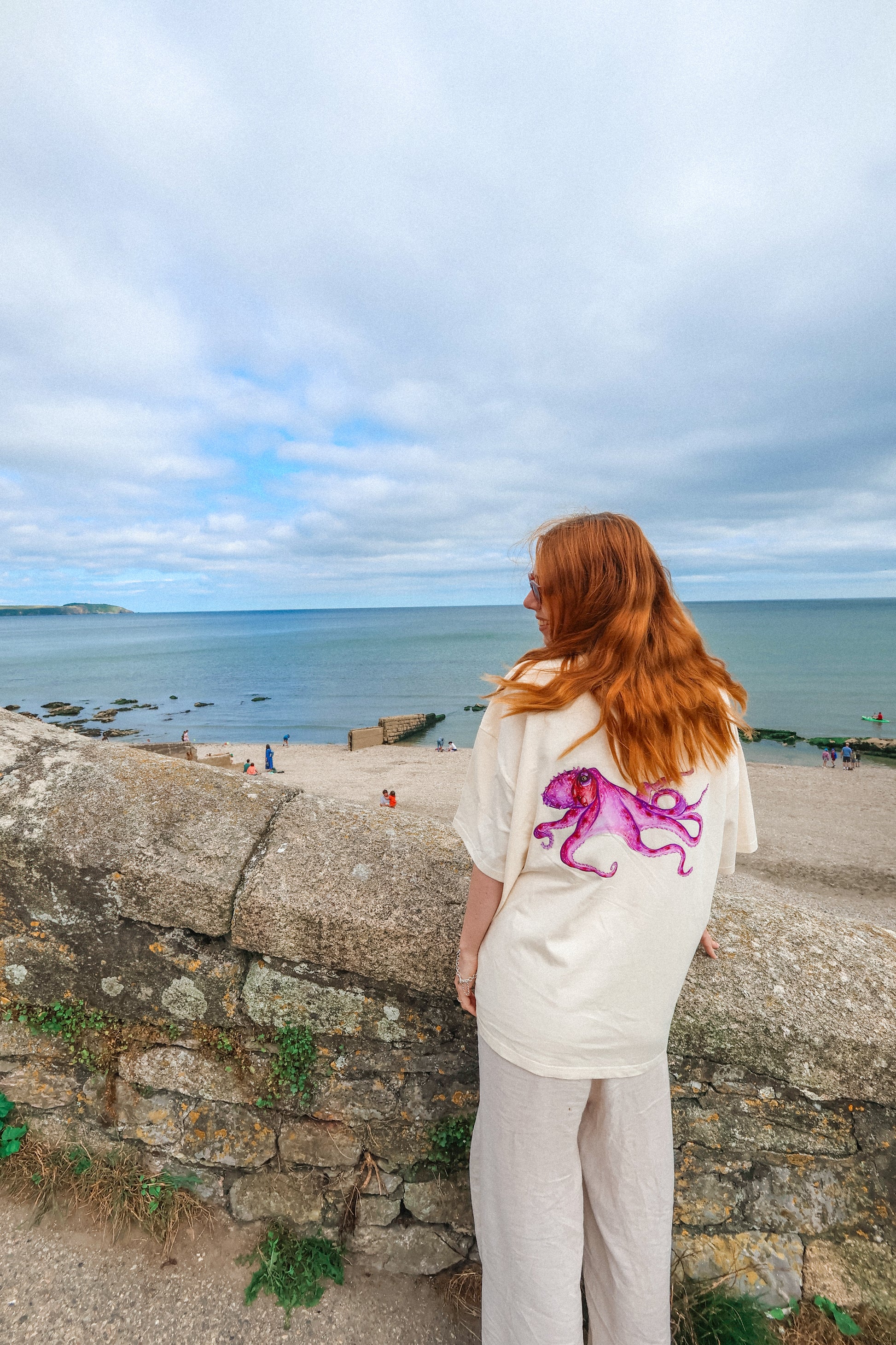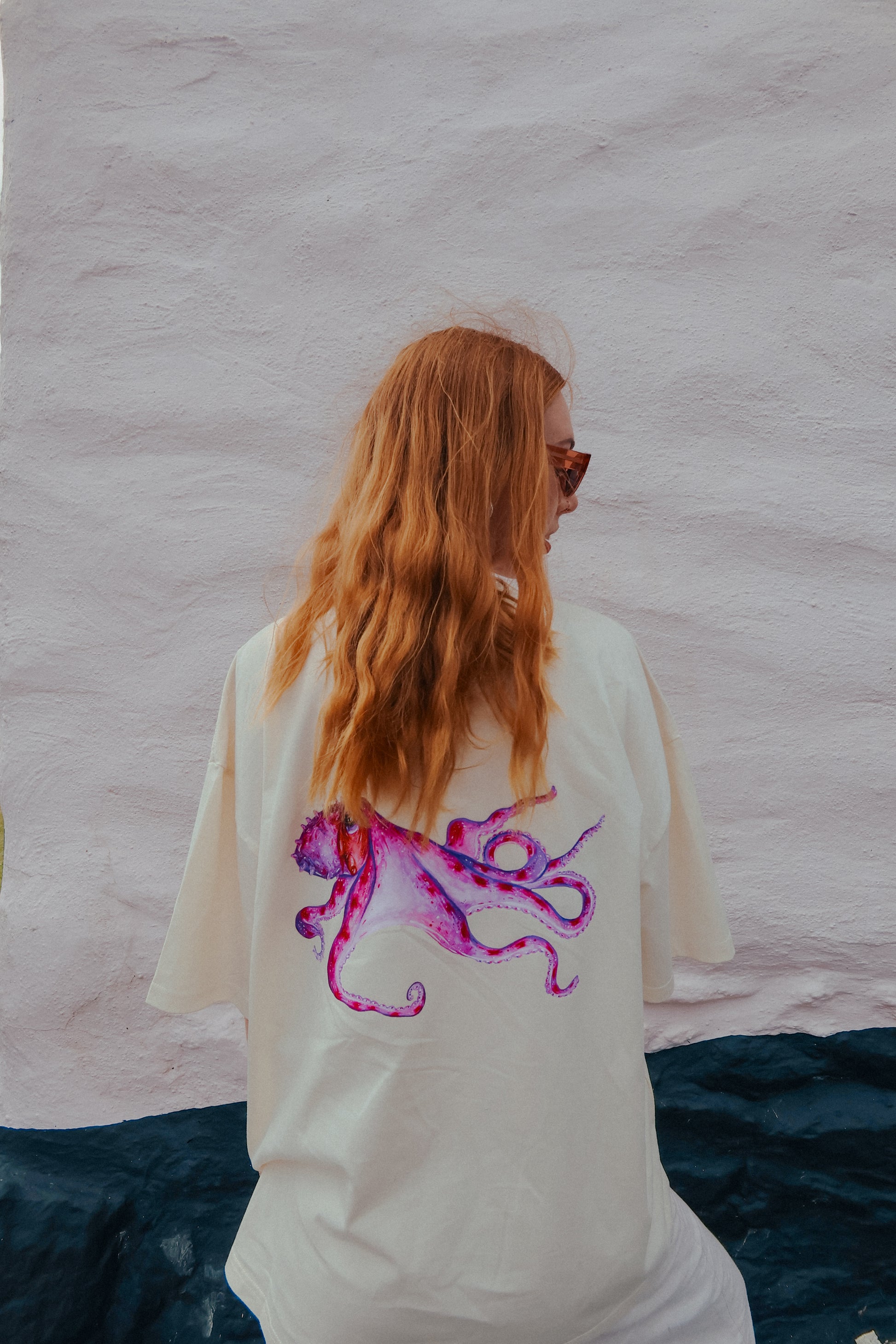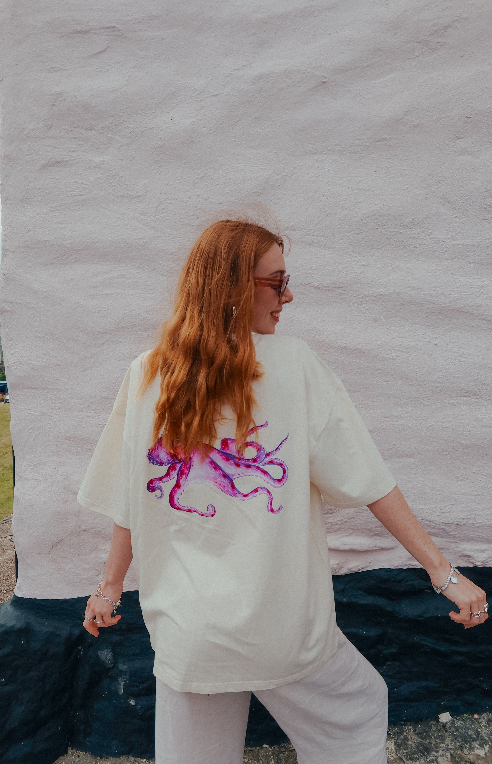 Featuring my original watercolour Octopus illustration, with a bold back print and a smaller version of the octopus on the chest. Designed for those who feel most at home by the sea.