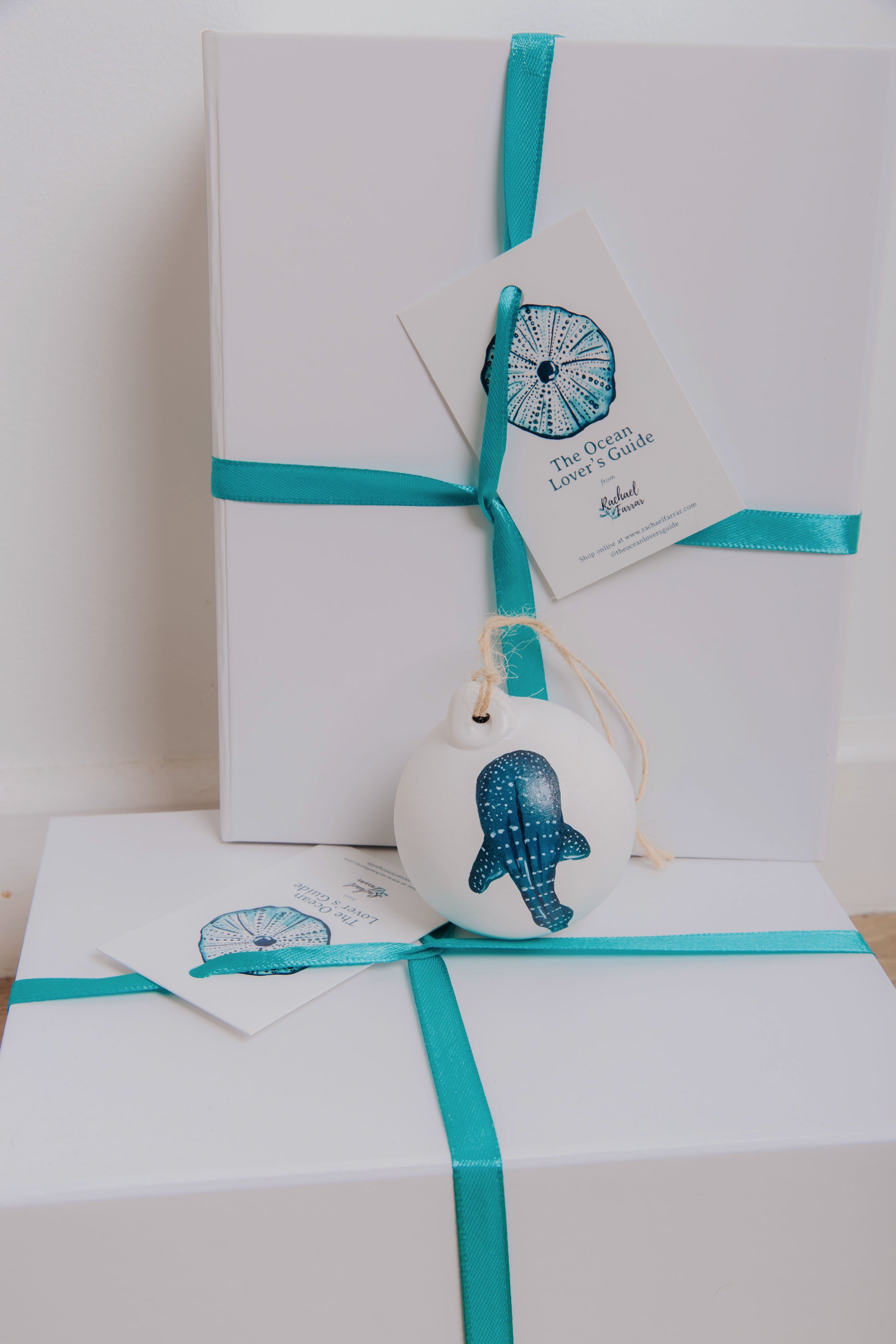 A hand painted porcelain bauble featuring a Spotted Eagle Ray. Each porcelain bauble is 6cm in diameter. The perfect addition to any ocean lovers Christmas tree or to keep up as a special ornament all year round! Each bauble will come on brown twine ready to hang straight on your tree.