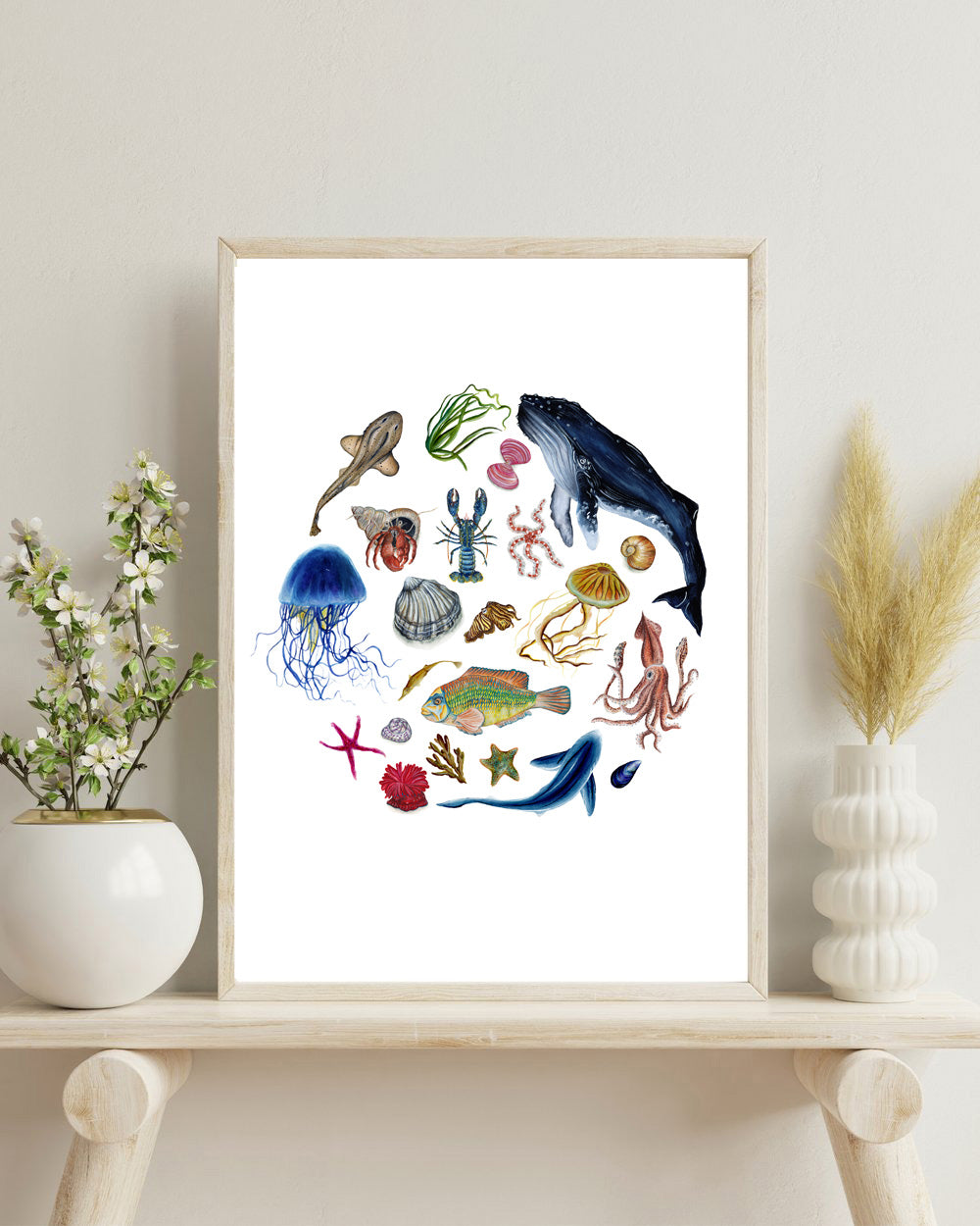 A fine art print to celebrate World Earth Day, featuring species from the Ocean Lover's Guide. Created from the original watercolour paintings, to celebrate the beautiful marine life found in the UK.
